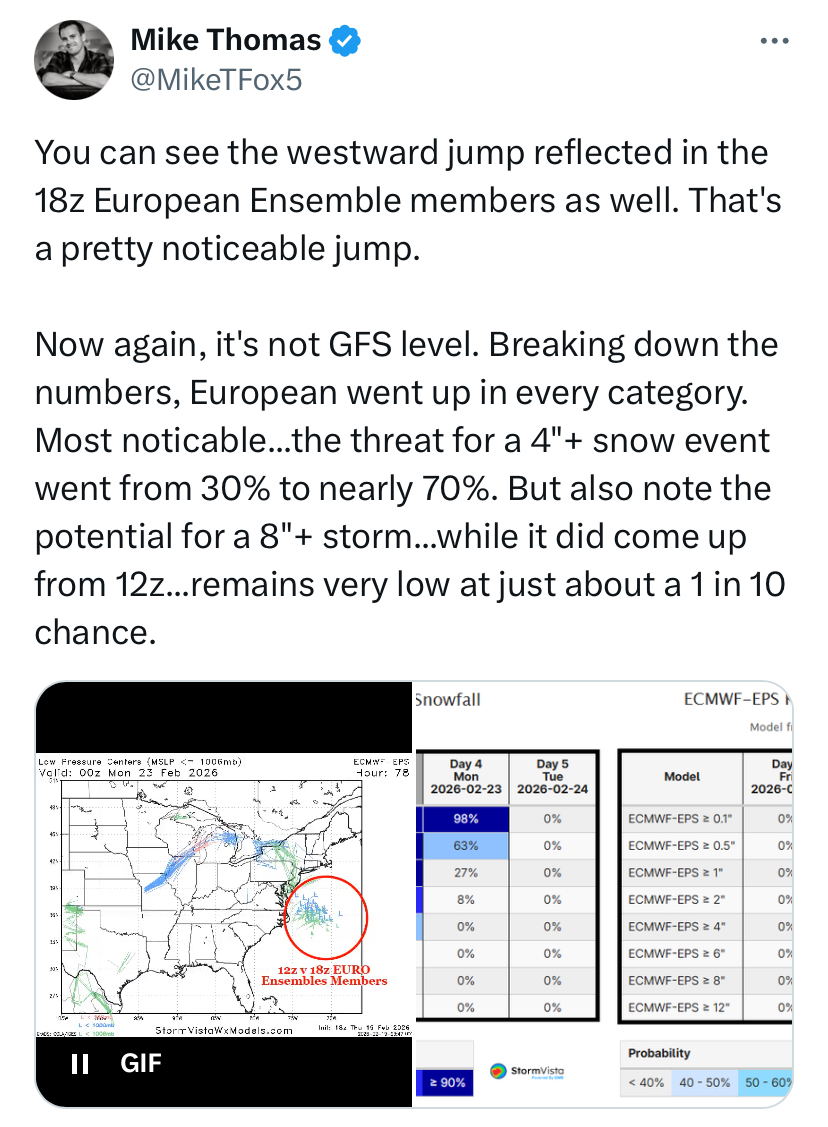 Inverted troughs are jumpy. Still has that feel of a rug pull east for the west guys. I think this has always been the risk, just seeing extra precip is good. Of note, 18z Euro also likes to play with our emotions. It did back with the Carolina storm.. Let's see models actually trend.